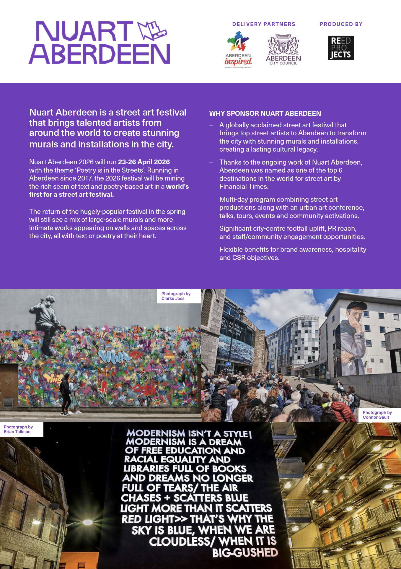 By sponsoring Nuart Aberdeen, you’ll help bring world-class street art to the Granite City while showcasing your brand as a champion of creativity and community. Sponsorship offers opportunities for visibility, media coverage, and meaningful engagement with audiences locally and internationally.