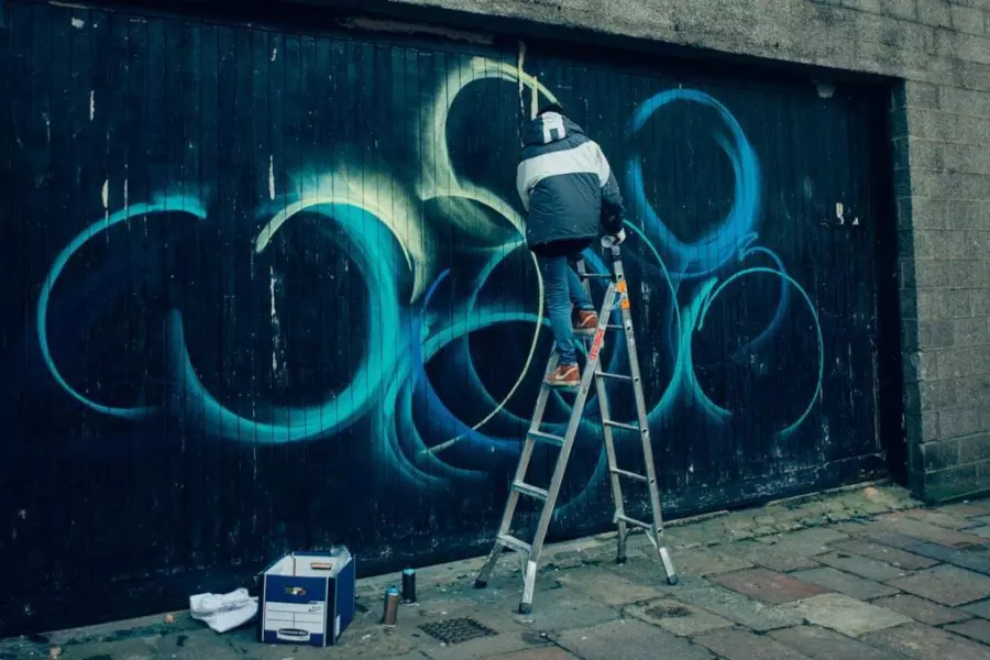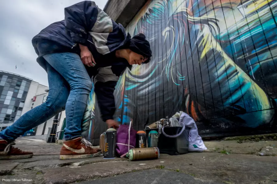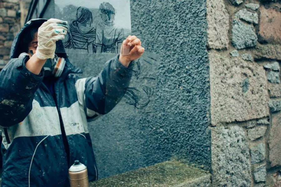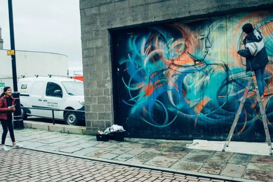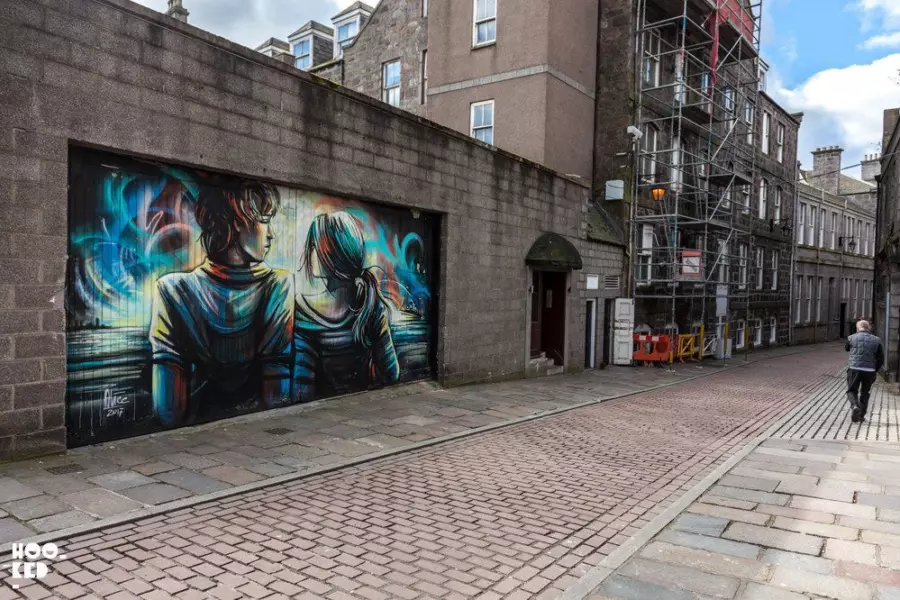 Alice is an Italian artist who created two stunning pieces for the festival with the face on school hill and the couple watching the cruise ships on Shiprow. Alice uses sketches on acetates to line up and work out her pieces, often trying a few before settling on a design. She roughly sketches out her pieces before using spray paint to add colour which brings her work to life. Her Belmont street mural took a couple of hours whilst Shiprow was painted over a couple of days. Coming from a traditional graffiti background, Alice has carved her own path in the street art world and is one of the most in demand artists of the now.