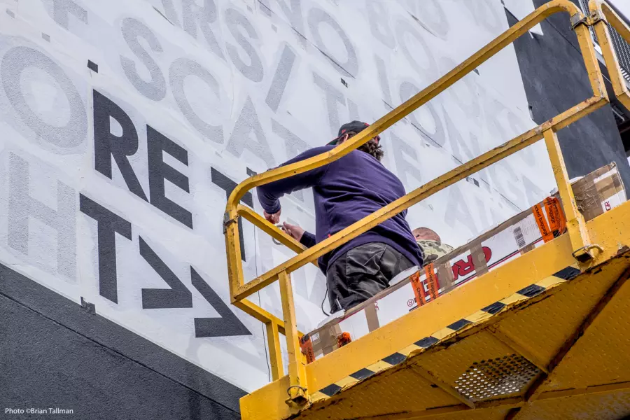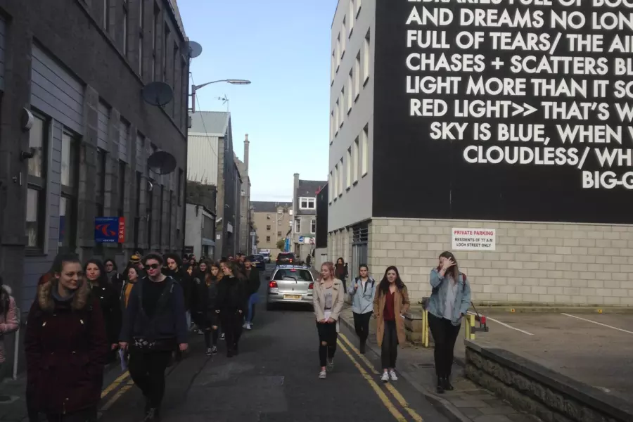 Straddling the contemporary and the street art world, Robert Montgomery is a Scottish artist now based in London. With work shown in galleries and musueums, it was on the streets that Roberts poems really have an impact. Dealing with complicated political and social issues, his street paste ups and poems have had a profound effect on the viewers, both locally and to a wider audience and his piece for Nuart Aberdeen looked at local business man and US president Donald Trump. A devisive figure, Montgomery used a section of a long poem to highlight the dreams and aspirations of the many which can be squashed by those in power. Painted over the course of 5 days, it provides a nice connection to his other works across the globe.