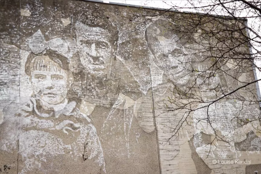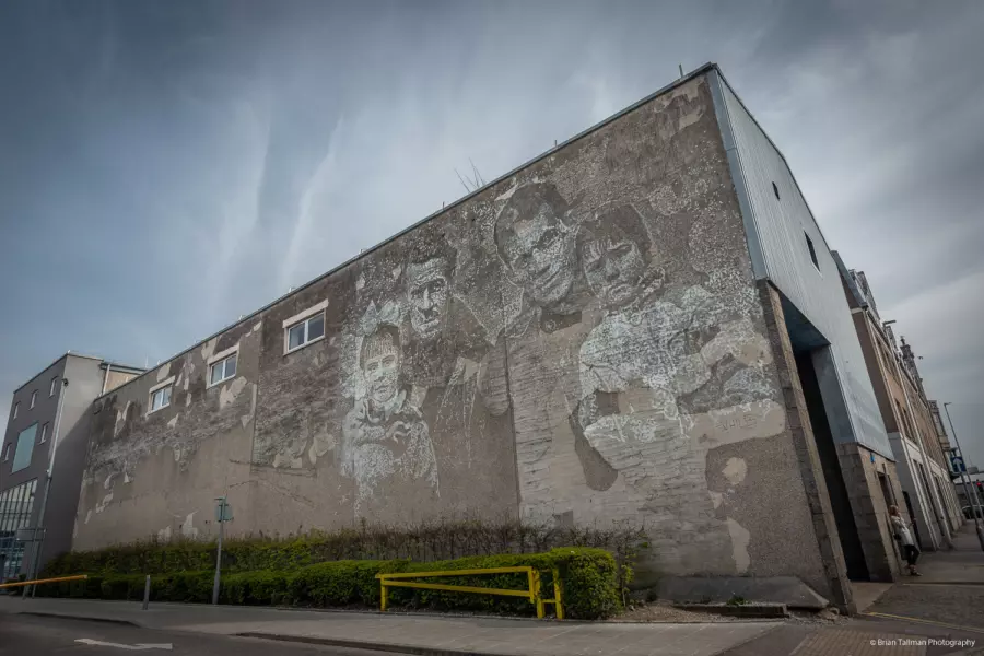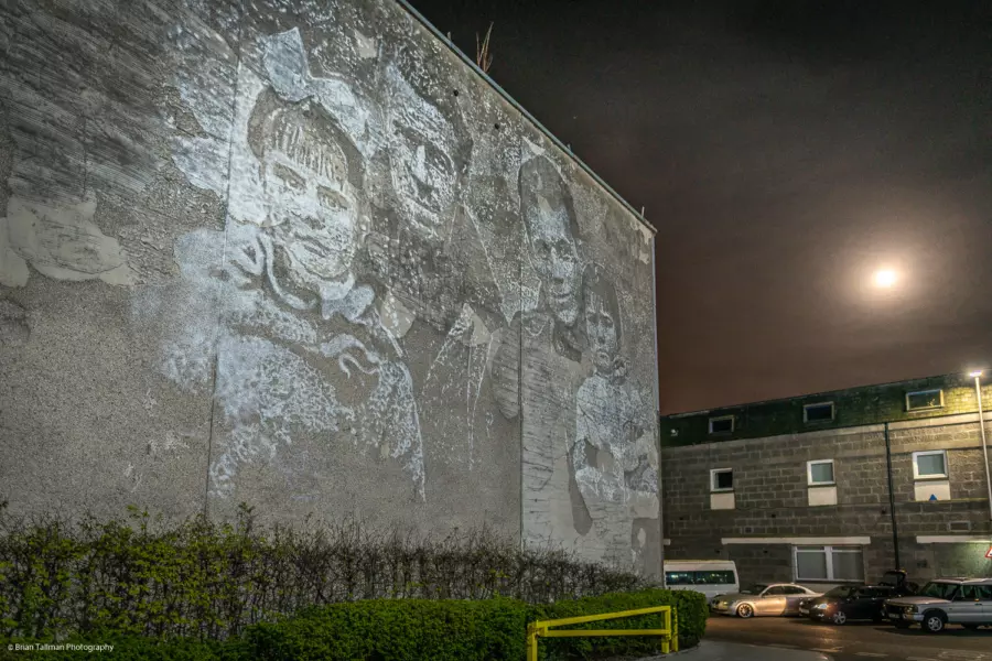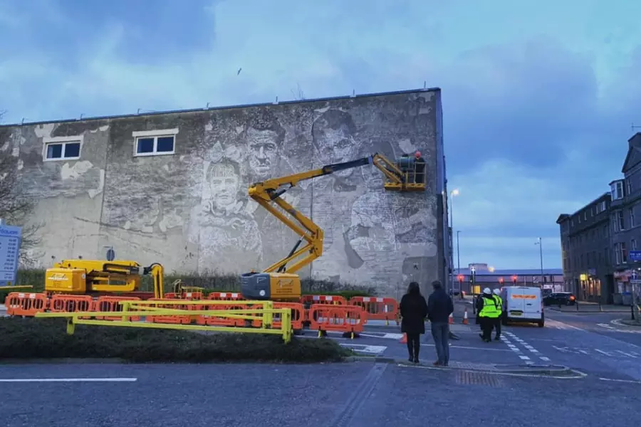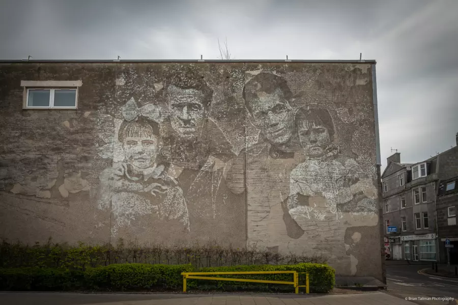 Vhil's mural was inspired by the story of Aberdonians who fought in the Spanish fascist regime in the 1930's. Vhil was fascinated by this story and delved deep in the history of these 19 men, 5 of which sadly died. The mural depicts two soldiers, American brigadier Peter Fyre on the right and John Londragan of Aberdeen. The story of these brave men and their bond with the Spanish is remarkable. This mural is helping to bring this story to life on the streets of Aberdeen to a new generation. Creating the mural required a lot of physical labour, craving by drilling into the wall to produce lots of detail.